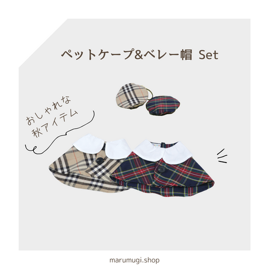 予約販売|首周り〜42cmまで|犬服|格子縞ケープ&ベレー帽セット