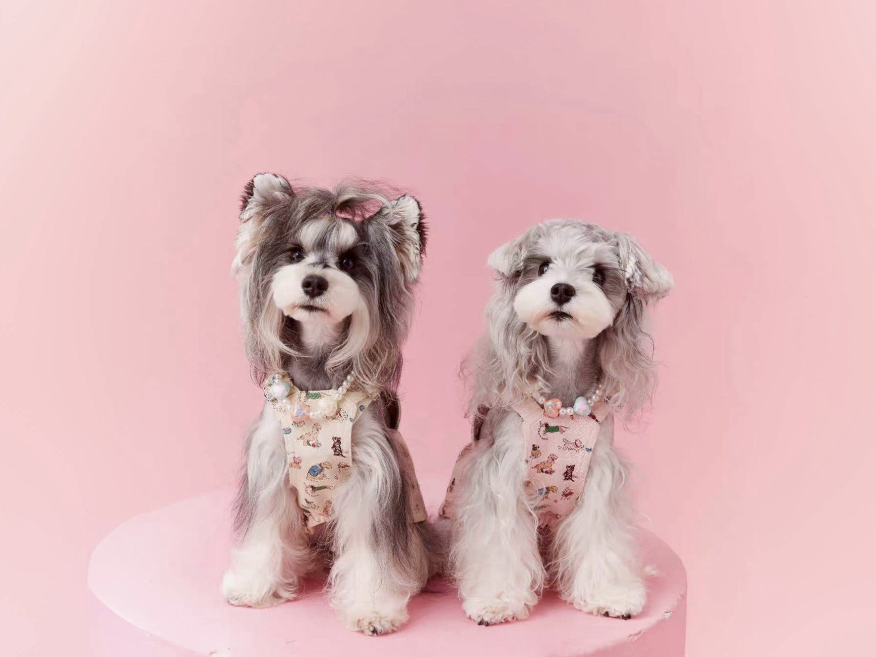 モデル(犬)🐶 シュナウザー 犬柄×ピンクサロペットスカート着用